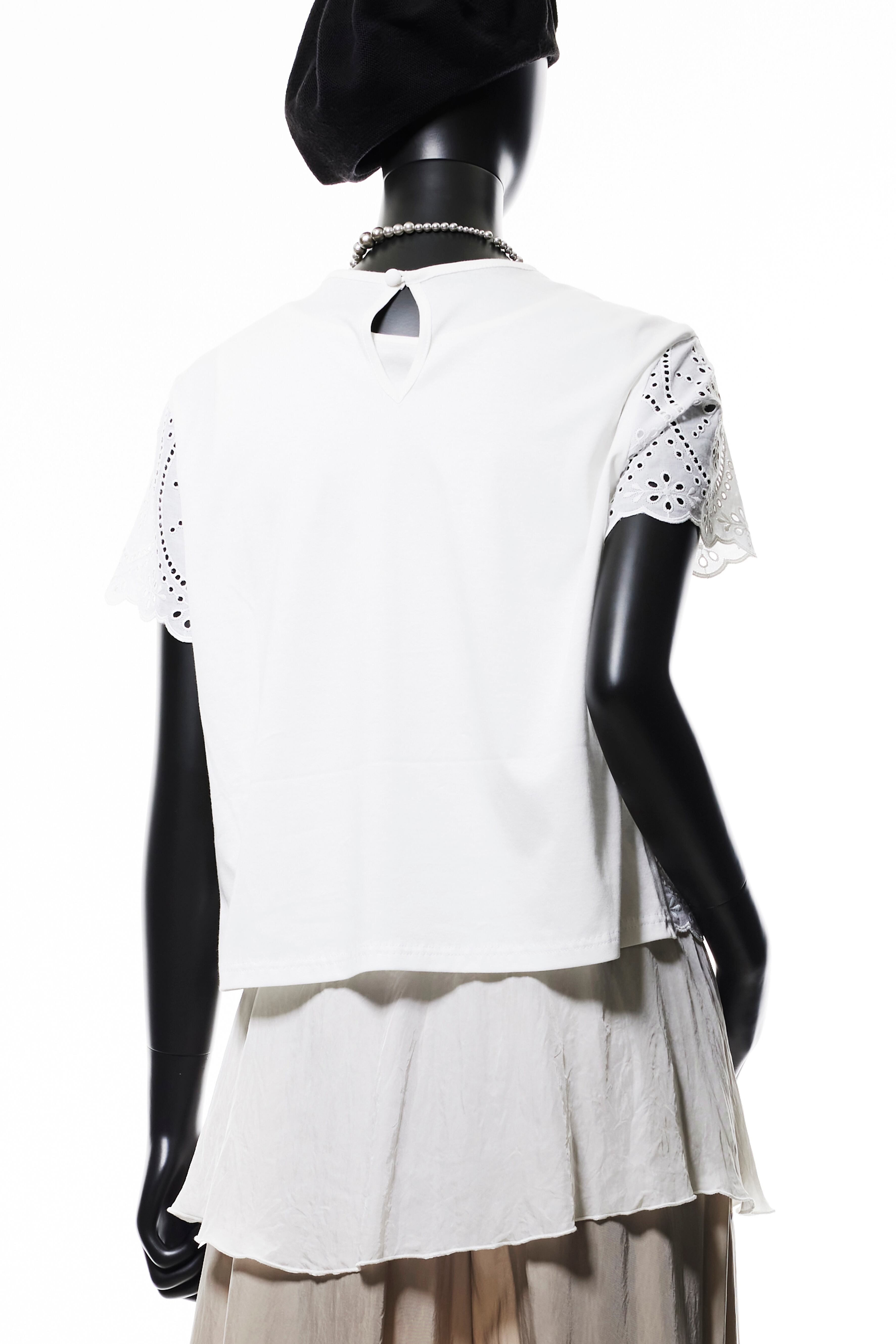 • 【221B013】バイカラークルー半袖ブラウス A_ホワイト×ホワイト
